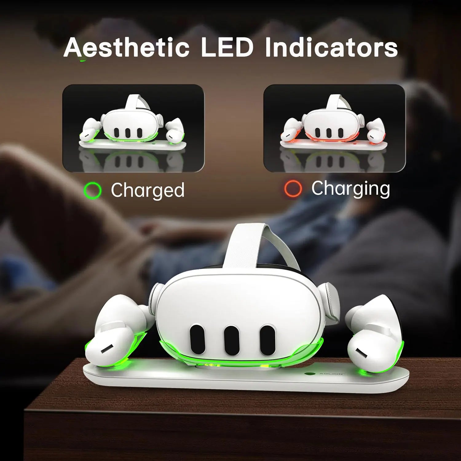 【Innovative Design for Quest 3】The extended charging pin and unique seesaw design make charging more convenient, stable and safe. The quest 3 charging dock is designed to charge Simultaneously headsets and Touch Plus controllers.